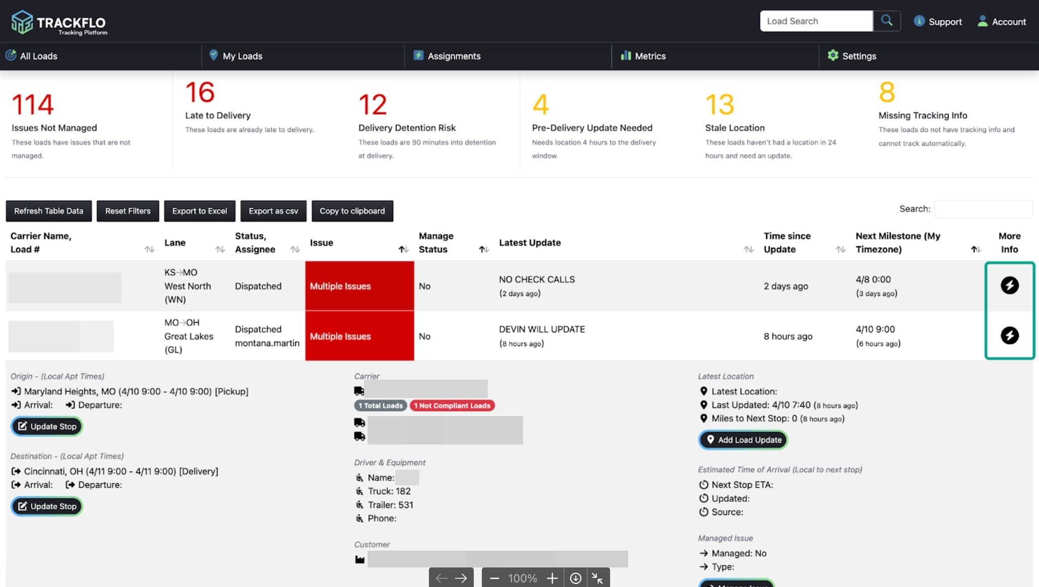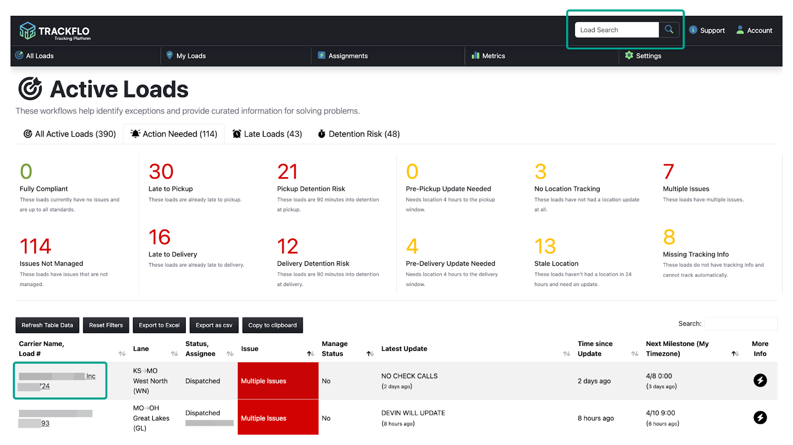 TrackFlo houses the information and actions you need to clear tracking load exceptions - nothing more, nothing less. You can view this information summarized on the More Info tray on the load on your Active Load page, or you can click into each load’s unique landing page for even more detail.